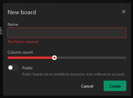 A board must always have a name and can either be public or private. Public boards are also accessible for users, that are not logged in (see access control for boards).
